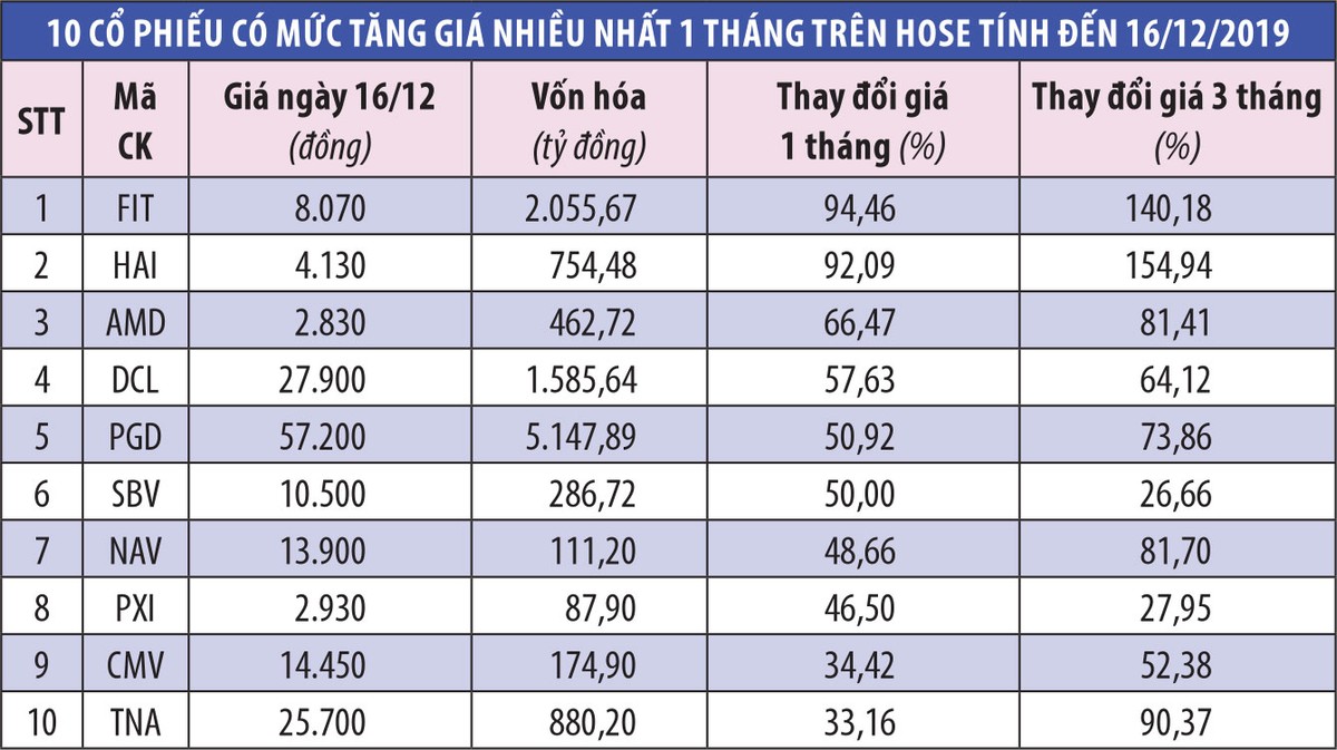 Thống kê Top 10 cổ phiếu tăng giá mạnh nhất trên HOSE trong 1 tháng trở lại đây cho thấy, đa phần trong số đó là những cổ phiếu có vốn hóa nhỏ, giá dưới hoặc quanh mệnh giá. Nhiều mã có mức tăng 1 tháng và 3 tháng trên 50%.