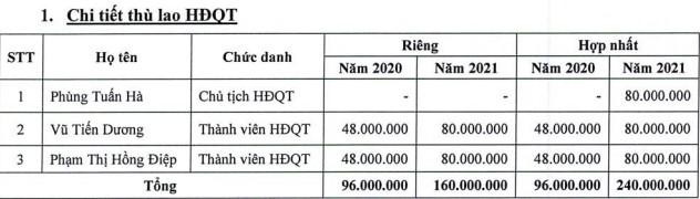 Ngoài ra, tiền lương Ban Tổng giám đốc năm 2021 tăng 2,4% so với cùng kỳ lên 3,76 tỷ đồng. Trong đó, ông Vũ Tiến Dương, Tổng giám đốc tăng 67,2% lên 746,17 triệu đồng, tương ứng trung bình 62,2 triệu đồng/tháng; ông Phùng Tuấn Hà, Chủ tịch HĐQT tăng 30,2% lên 938,79 triệu đồng, tương ứng 78,2 triệu đồng/tháng. Đặc biệt, lương của bà Phạm Thị Hồng Điệp, Phó tổng giám đốc tăng tới 275,7% từ 220 triệu đồng trong năm 2020 lên 826,5 triệu đồng năm 2021, cao hơn cả lương Tổng giám đốc.