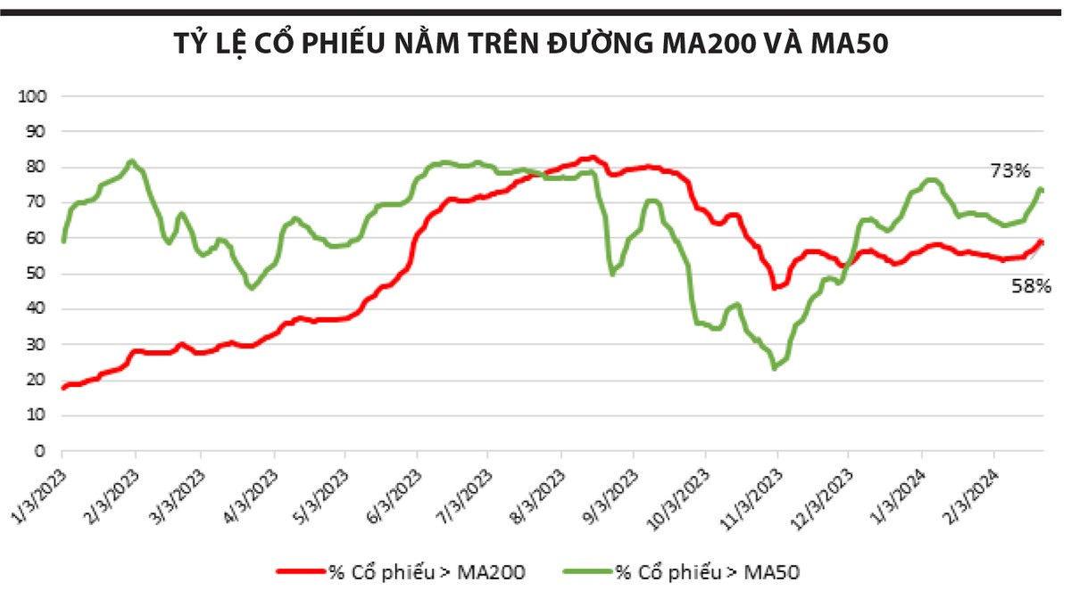 Bất chấp những rung lắc hiện tại, chúng tôi tin tưởng thị trường còn dư địa tăng, bởi có một chỉ báo quan trọng giúp củng cố niềm tin vào thị trường. Cụ thể, thống kê số lượng cổ phiếu nằm trên đường trung bình 200 ngày (MA200) và 50 ngày (MA50) trong quá khứ cho thấy, thị trường thường tạo đỉnh khi thỏa mãn 2 điều kiện: một là, có hơn 70% số lượng cổ phiếu nằm trên cả 2 đường MA200 và MA50; hai là, số lượng cổ phiếu nằm trên đường MA200 lớn hơn số lượng cổ phiếu nằm trên đường MA50.
