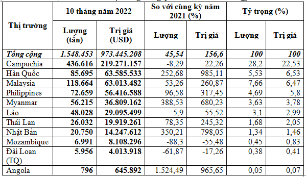 Theo số liệu thống kê của Tổng cục Hải quan, 10 tháng năm 2022 cả nước xuất khẩu gần 1,55 triệu tấn phân bón các loại, tương đương 973,45 triệu USD, tăng mạnh 45,5% về lượng, tăng 156,6% về kim ngạch so với cùng kỳ.