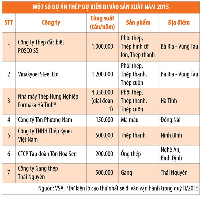 Theo VSA, trong năm 2015 sẽ có thêm nhiều dự án lớn đưa vào sản xuất tại cả ba miền trên cả nước (xem bảng), đồng thời tiến độ thực hiện dự án của Formosa cũng là điều đáng lưu ý.