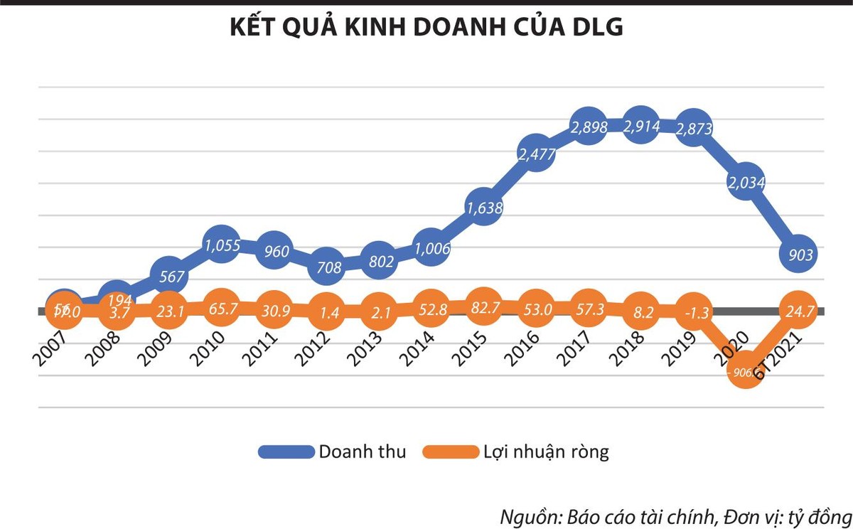 Bước sang năm 2021, tình hình kinh doanh của DLG được cải thiện khi doanh thu và lợi nhuận trong nửa đầu năm đạt lần lượt 903 tỷ đồng và 24,7 tỷ đồng. Cổ phiếu DLG vẫn bị kiểm soát do gánh nặng cũ để lại là khoản lỗ luỹ kế hơn 842 tỷ đồng. Hiện tại, DLG đang phải đối mặt với “án” huỷ niêm yết bắt buộc nếu như năm 2021, doanh nghiệp tiếp tục thua lỗ.