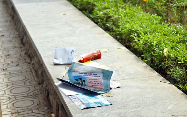 Tờ rơi vương vãi khắp nơi ảnh hưởng đến mỹ quan đô thị. (Ảnh: Hồng Minh)