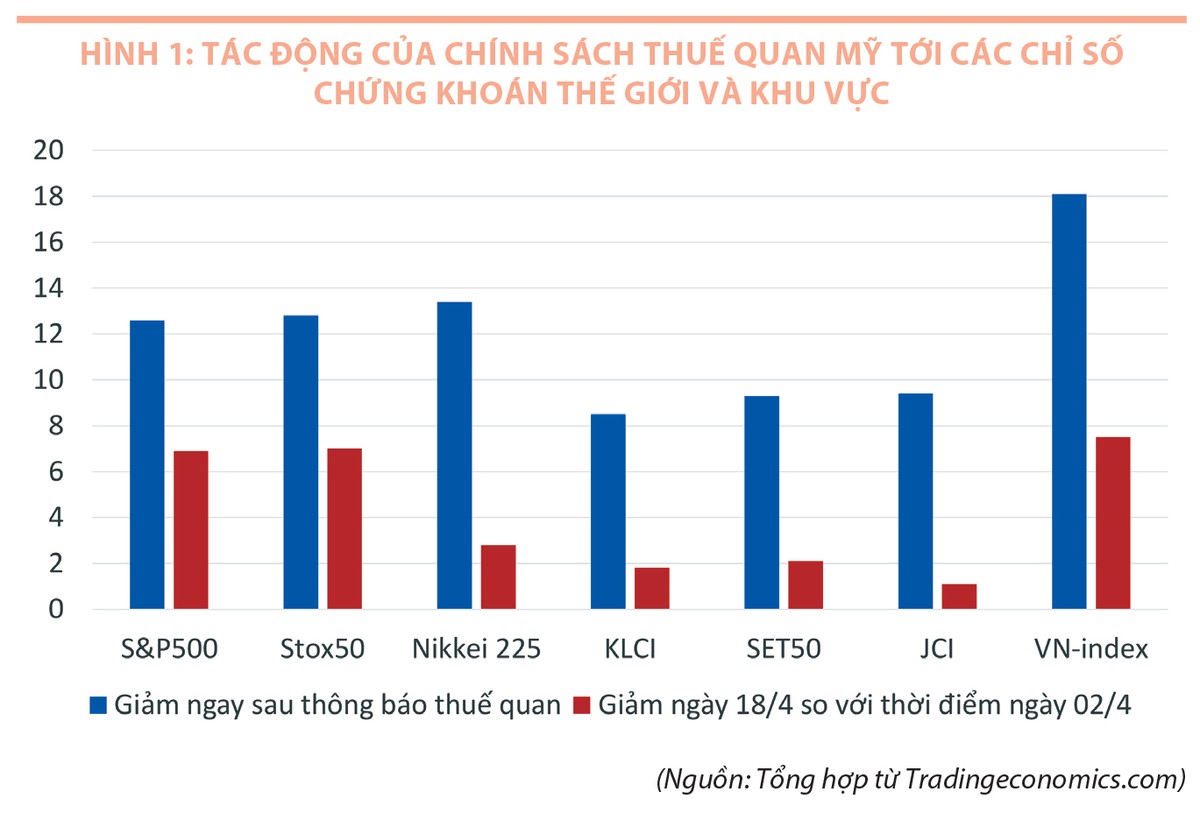 Cụ thể, thị trường chứng khoán Thái Lan giảm khoảng 9,3%; Malaysia giảm 8,5%; Indonesia giảm 9,4%..., còn Việt Nam giảm tới hơn 18%. Sau khi Mỹ công bố tạm ngừng việc áp thuế đối ứng trong vòng 90 ngày với các đối tác thương mại, các thị trường Thái Lan, Malaysia, Indonesia… đều phục hồi về gần mức ban đầu, nhưng Việt Nam vẫn giảm 7,5% (Hình 1).