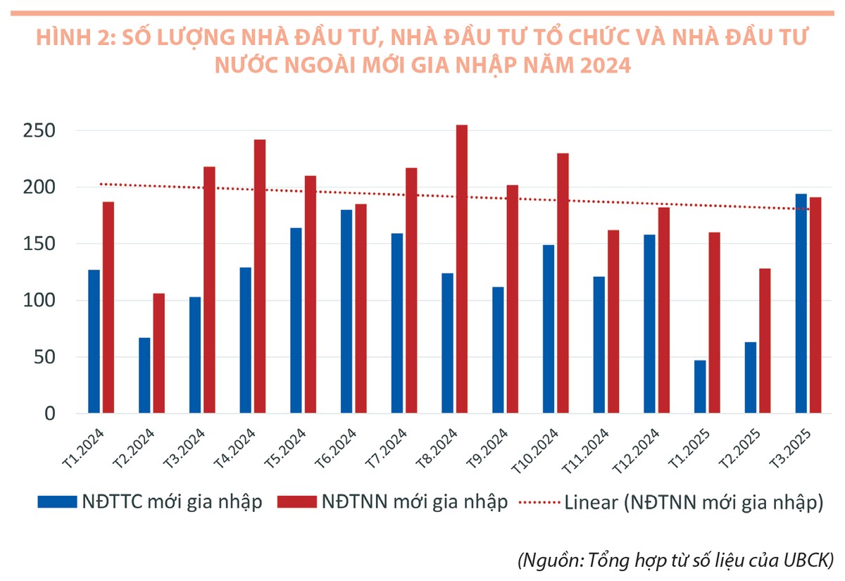 Xét về tổng thể, tính đến hết tháng 3/2025, số lượng tài khoản đầu tư trên thị trường chứng khoán là 9,69 triệu tài khoản, tăng 4,2% so với cuối năm 2024. Trung bình mỗi tháng, số lượng tài khoản mở mới tăng thêm 130.000 tài khoản, giảm khoảng 30.000 tài khoản/tháng so với bình quân của năm 2024. Trong đó, các nhà đầu tư cá nhân chiếm gần như tuyệt đối về số lượng với 9,66 triệu tài khoản, các nhà đầu tư tổ chức đạt 22.680 tài khoản, nhà đầu tư nước ngoài đạt 48.260 tài khoản. Bên cạnh đó, số lượng các nhà đầu tư nước ngoài mới đang có xu hướng giảm thời gian qua. Các nhà đầu tư tổ chức và nhà đầu tư nước ngoài chỉ tăng bình quân 126 tài khoản/tháng và 192 tài khoản/tháng trong giai đoạn từ năm 2024 đến quý I/2025, mức tăng này giảm khá mạnh so với năm 2023 lần lượt là 279 tài khoản/tháng và 256 tài khoản/tháng (Hình 2).