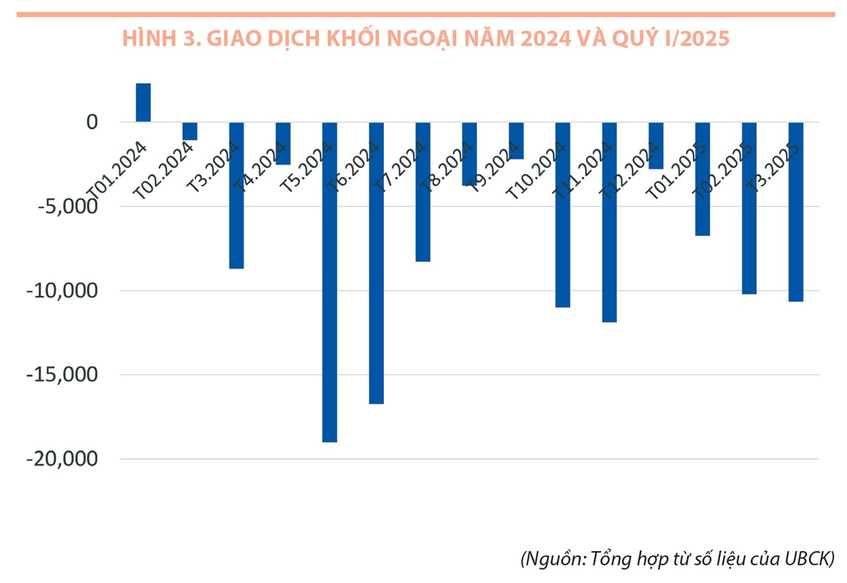 Bên cạnh giảm về số lượng mới gia nhập, một vấn đề nữa là xu hướng bán ròng của nhà đầu tư nước ngoài. Tính chung cả năm 2024, khối này đã bán ròng 85.700 tỷ đồng trên thị trường cổ phiếu ở cả 3 sàn, vượt xa năm 2023 là 22.00 tỷ đồng. Đáng chú ý, ngoại trừ việc mua ròng 2.300 tỷ đồng trong tháng 1/2024, khối ngoại đã bán ròng gần như suốt cả năm qua và xu hướng này tiếp tục kéo dài trong những tháng đầu năm 2025, với giá trị bán ròng khoảng 27.600 tỷ đồng tính đến cuối quý I/2025 (Hình 3).