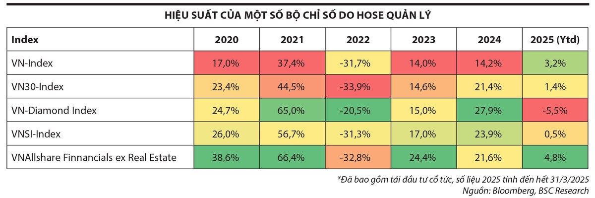 Thị trường cần có thêm các bộ chỉ số đại diện phổ quát và doanh nghiệp niêm yết mới thuộc nhiều nhóm ngành khác nhau. Đây là cơ sở để triển khai các quỹ ETF đầu tư theo chủ đề (thematic) và các bộ chỉ số theo ngành. Theo đó, cơ quan quản lý nên xây dựng nhóm sản phẩm ETF cốt lõi cho thị trường và theo ngành phù hợp với thế mạnh của Việt Nam. Ví dụ, khuyến khích các doanh nghiệp FDI niêm yết (ETF FDI), ETF chuyên về cổ tức, thu nhập cố định, ETF ngành ngân hàng, bất động sản và ETF hàng hóa (vàng, nông sản). Bên cạnh đó, hợp tác với MSCI, FTSE để phát triển chỉ số thematic - cơ sở để triển khai các ETF theo từng chủ đề riêng biệt như Fintech, Robot, AI, Big Data.