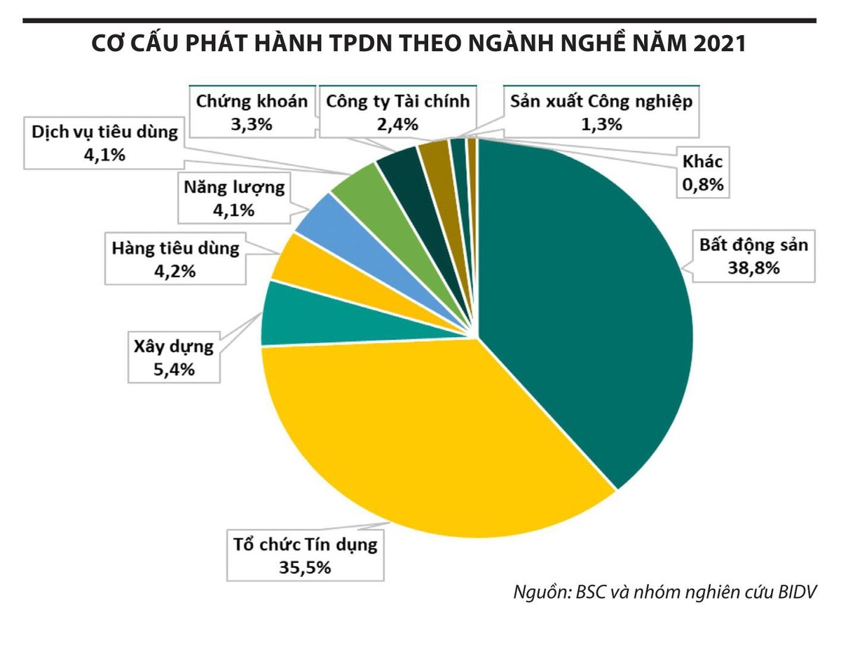 Năm 2021, các doanh nghiệp bất động sản là nhóm phát hành trái phiếu lớn nhất, với tổng quy mô phát hành khoảng 244.000 tỷ đồng (chiếm tỷ trọng 39%), tiếp theo là tổ chức tín dụng với khoảng 223.000 tỷ đồng (36%), xây dựng (5%), hàng tiêu dùng (4%), năng lượng (4%), dịch vụ tiêu dùng (4%), chứng khoán (3%) ...