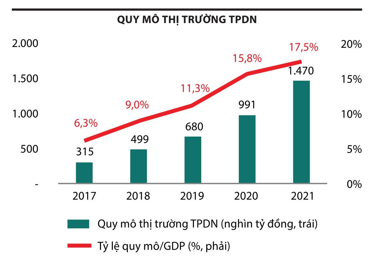 Nghị định 153/2020/NĐ-CP (có hiệu lực từ đầu năm 2021) được ban hành nhằm tiếp tục chuẩn hóa hoạt động phát hành trái phiếu doanh nghiệp theo hướng quy định chặt chẽ hơn về điều kiện tham gia thị trường trái phiếu đối với cả tổ chức phát hành và nhà đầu tư. Tuy nhiên, thị trường trái phiếu doanh nghiệp vẫn phát triển mạnh trong năm 2021 với tổng quy mô phát hành đạt 657.000 tỷ đồng, tăng 42% so với năm 2020. Trong đó, trái phiếu huy động trên thị trường quốc tế là 1,74 tỷ USD, tương đương 40.000 tỷ đồng. Ước tính quy mô thị trường đạt khoảng gần 1,5 triệu tỷ đồng, tương đương 17,5% GDP.