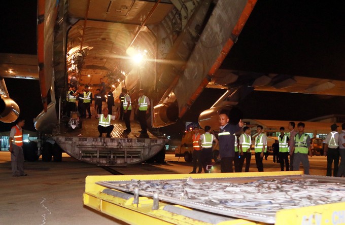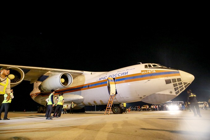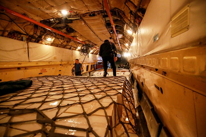 Hơn 10 phút đáp xuống sân bay, hệ thống khoan lái cỡ lớn phía sau chiếc IL-76 được mở để trao gói hàng viện trợ.