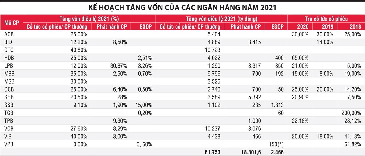 Cụ thể, vốn điều lệ tại các ngân hàng này theo kế hoạch tăng 82,7 nghìn tỷ đồng, trong đó 61,8 nghìn tỷ đồng (75%) ước tính tăng qua chia tách cổ phiếu, 18,3 nghìn tỷ đồng (22%) từ phát hành riêng lẻ và/hoặc phát hành quyền mua cổ phiếu và 2,6 nghìn tỷ đồng (3%) thông qua phát hành cổ phiếu theo chương trình chọn lựa cho người lao động (ESOP).
