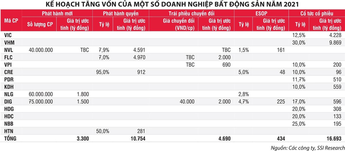 Trong khi đó, đã có ít nhất gần chục công ty bất động sản lên kế hoạch tăng vốn năm 2021, với số tiền dự kiến ban đầu là 18,7 nghìn tỷ đồng thông qua phát hành riêng lẻ, phát hành quyền mua cổ phiếu, trái phiếu chuyển đổi và 434 tỷ đồng thông qua cổ phiếu ESOP.