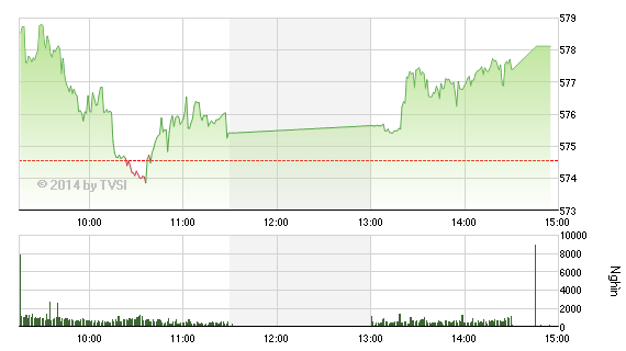 Kết thúc phiên giao dịch chiều 19/2, VN-Index tăng 3,56 điểm (+0,62%), lên 578,12 điểm. Tổng khối lượng khớp lệnh đạt 153,44 triệu đơn vị, giá trị 2.321 tỷ đồng. Giao dịch thỏa thuận đạt 5,65 triệu đơn vị, giá trị 230,9 tỷ đồng. VN30-Index cũng tăng khá với 4,83 điểm (+0,75%), lên 650,43 điểm.