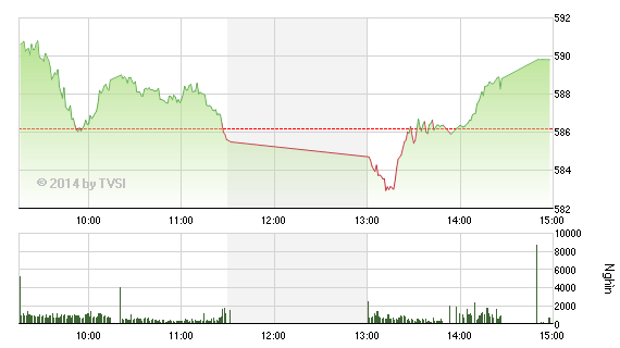 Ngay sau khi thấy bên bán rút quân, bên mua đã đồng loạt phản công, giúp VN-Index tiến dần về mốc tham chiếu, với sắc xanh lấn dần trên bảng điện tử. Khoảng từ 2h, bên mua đã hoàn toàn áp đảo và chiếm thế chủ động, kéo VN-Index tăng dần và thiếu chút nữa đã cán mốc 590 điểm khi đóng cửa phiên.