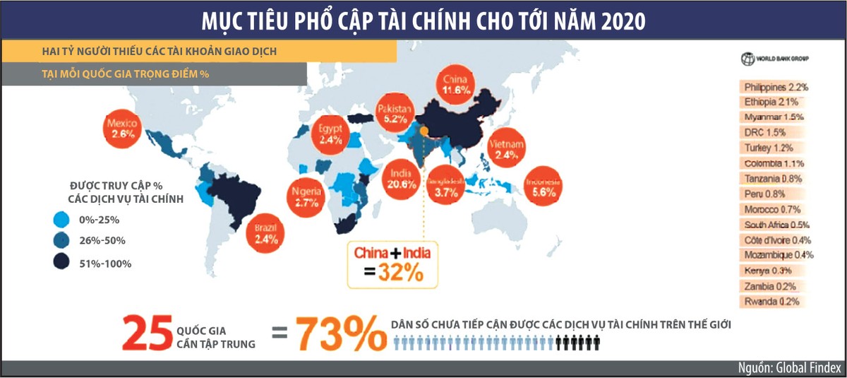 Tỷ lệ người trưởng thành không có tài khoản ngân hàng tập trung chủ yếu ở 25 quốc gia (trong đó có Việt Nam) chiếm 73% số người không có tài khoản trên toàn cầu, riêng Ấn Độ và Trung Quốc là hai quốc gia đã chiếm đến 32% tổng con số thống kê