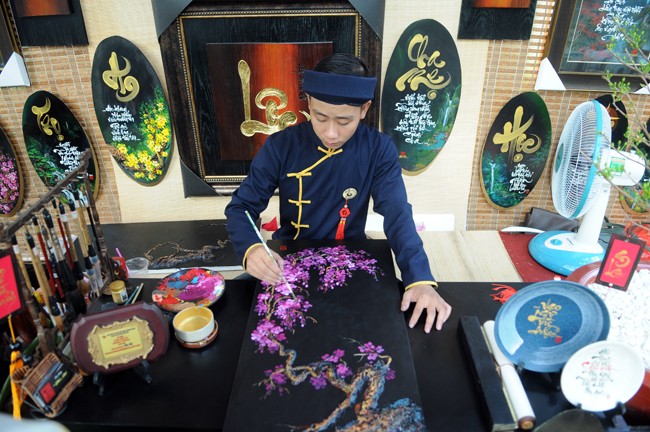 Và cả vẽ tranh hoa đào bán cho khách tham quan.