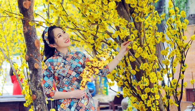 Các cô gái trẻ trong tà áo dài truyền thống, tạo dáng bên gốc mai vàng khoe sắc trong khung cảnh Tết xưa.