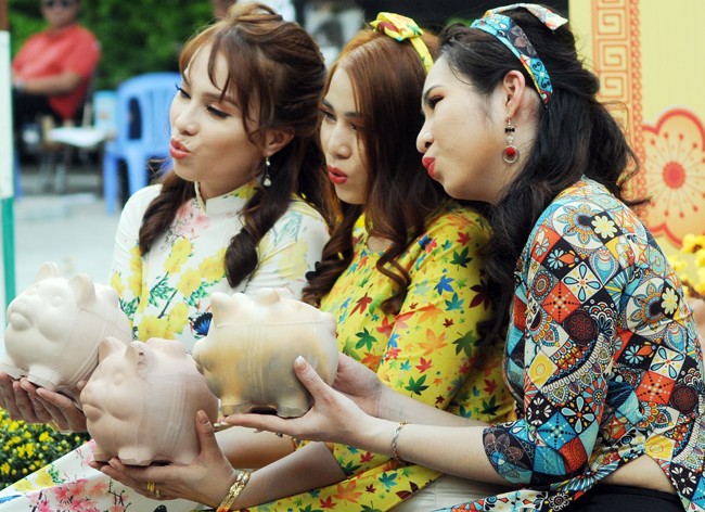 Những cô gái “check in” với những chú heo đất tại phố ông Đồ.
