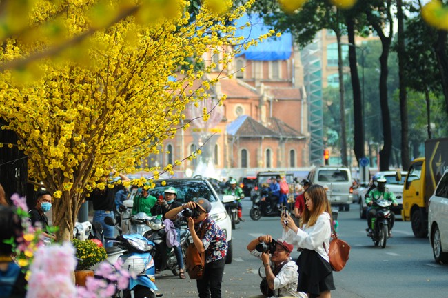 Hàng hoa mai trên đường Phạm Ngọc Thạch luôn thu hút người dân mỗi khi lưu thông qua đây.