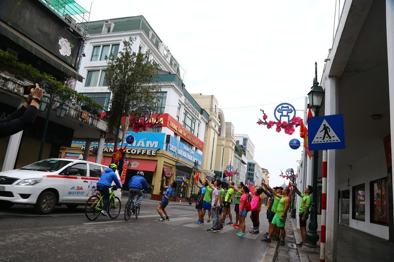 Một nhóm chạy bộ ngày mùng 1 Tết dừng lại chụp ảnh giữa đường Tràng Tiền