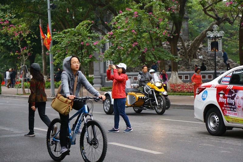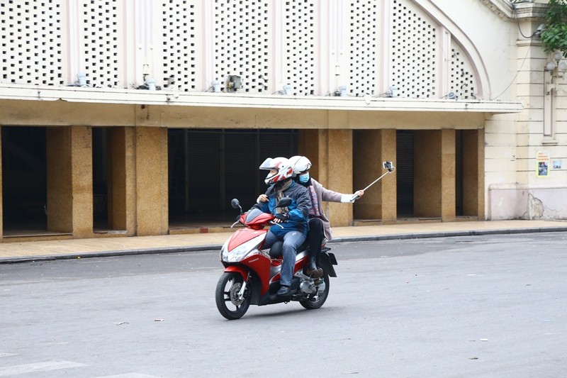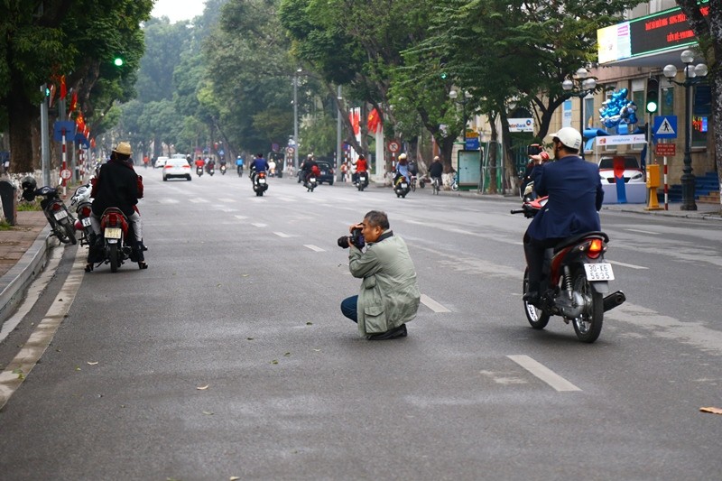 Nhiều nhiếp ảnh gia ngồi giữa đường thoải mái tác nghiệp, người đi xe máy cũng vừa đi vừa "selfie"
