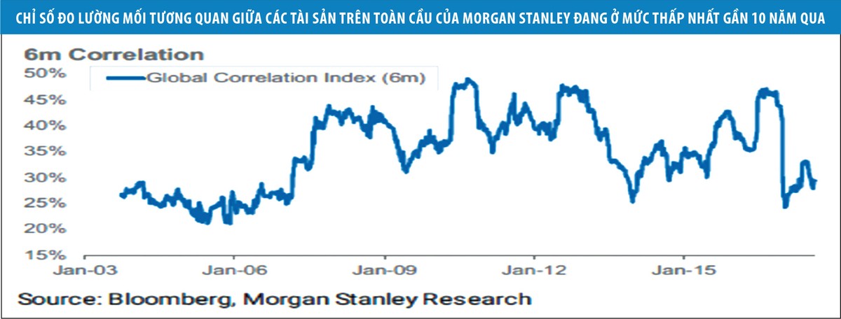 Mô hình của Morgan Stanley cho thấy, các loại tài sản trên thế giới đang ít có liên hệ với nhau nhất trong gần 1 thập kỷ qua.