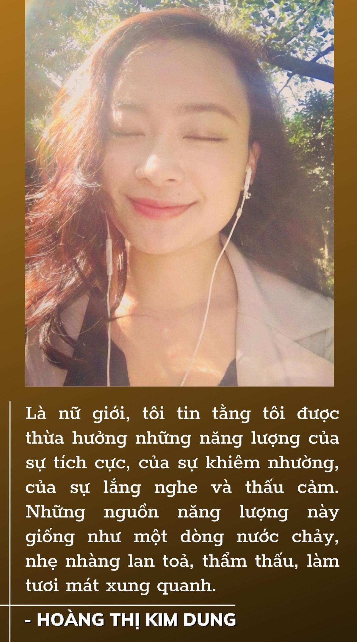 -Hoàng Thị Kim Dung: Thú thực tôi không biết tôi có phải người phù hợp nhất để trả lời câu hỏi này hay không, vì tôi ít khi được ai khen ngợi về sự nữ tính của mình lắm. Tuy nhiên là nữ giới, tôi tin tằng tôi được thừa hưởng những năng lượng của sự tích cực, của sự khiêm nhường, của sự lắng nghe và thấu cảm. Những nguồn năng lượng này giống như một dòng nước chảy, nhẹ nhàng lan toả, thẩm thấu, làm tươi mát xung quanh.
