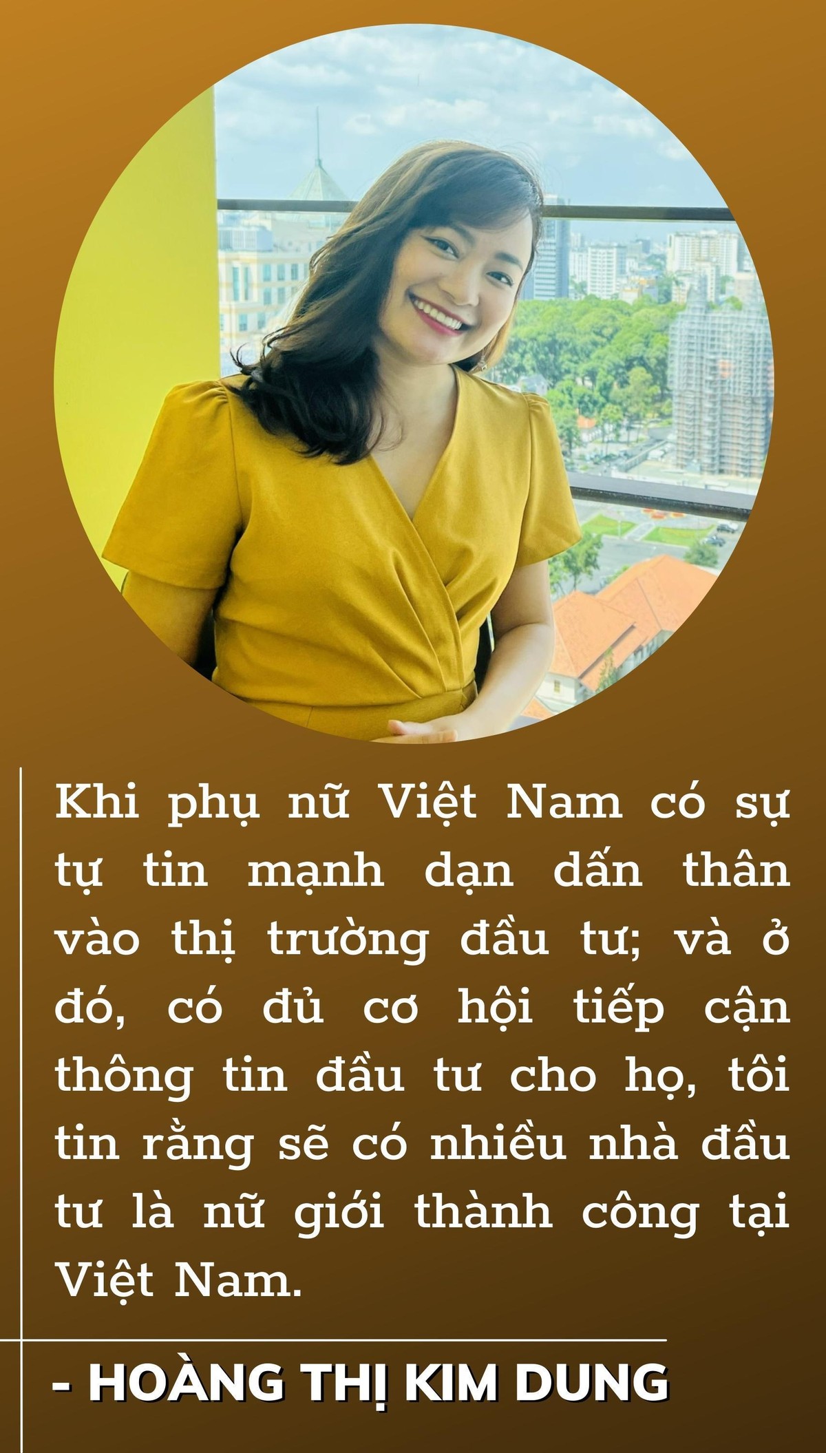 Do đó, một khi phụ nữ Việt Nam có sự tự tin mạnh dạn dấn thân vào thị trường đầu tư; và ở đó, có đủ cơ hội tiếp cận thông tin đầu tư cho họ, tôi tin rằng sẽ có nhiều nhà đầu tư là nữ giới thành công tại Việt Nam.