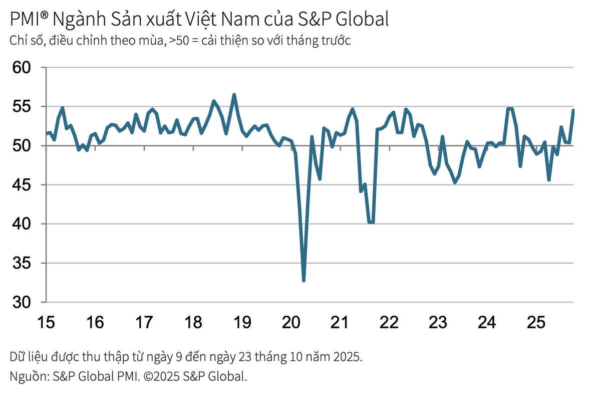Theo S&P Global, Chỉ số Nhà Quản trị Mua hàng (PMI®) ngành sản xuất Việt Nam đạt 54,5 điểm trong tháng 10, tăng mạnh so với mức 50,4 điểm của tháng 9, phản ánh sức khỏe ngành sản xuất cải thiện đáng kể và các điều kiện kinh doanh đã đạt mức tăng trưởng mạnh nhất kể từ tháng 7/2024. Tất cả năm cấu phần của chỉ số PMI chính đều đóng góp tích cực vào đà tăng này.