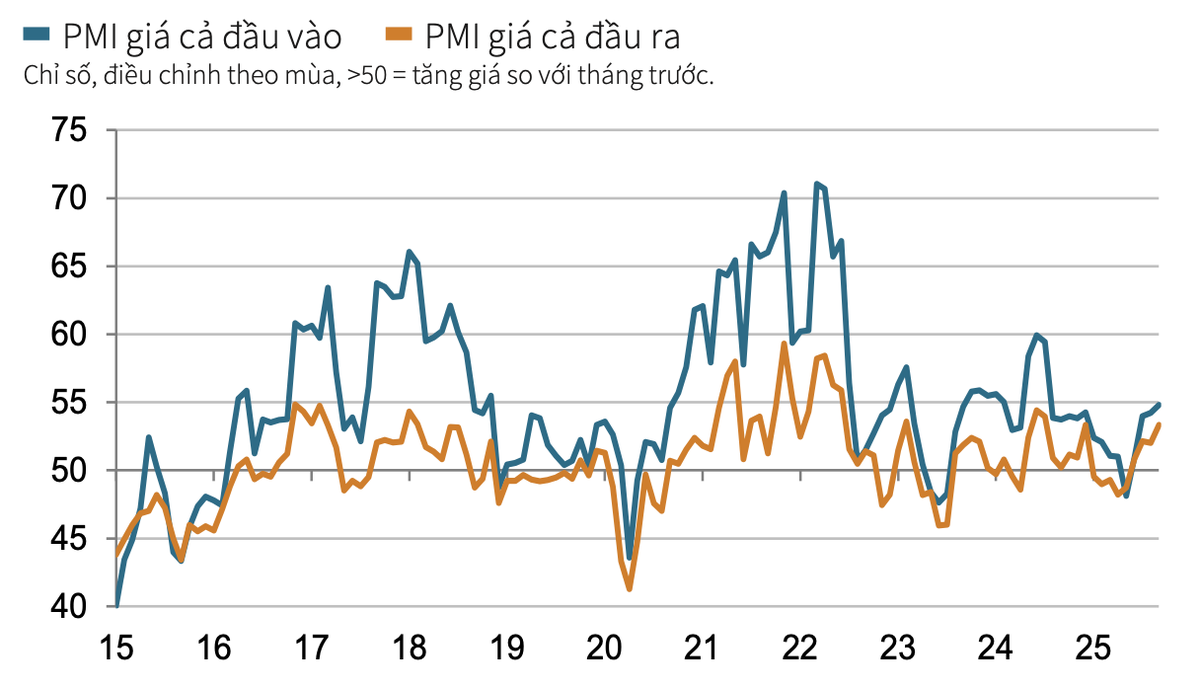 Áp lực lạm phát gia tăng vào cuối quý III khi chi phí đầu vào và giá bán đều tăng nhanh hơn. Đây là mức tăng chi phí đầu vào mạnh nhất kể từ tháng 7/2024, nguyên nhân được cho là do giá thị trường cao hơn và biến động tỷ giá bất lợi. Giá bán hàng vì vậy cũng tăng với tốc độ nhanh nhất trong 14 tháng.