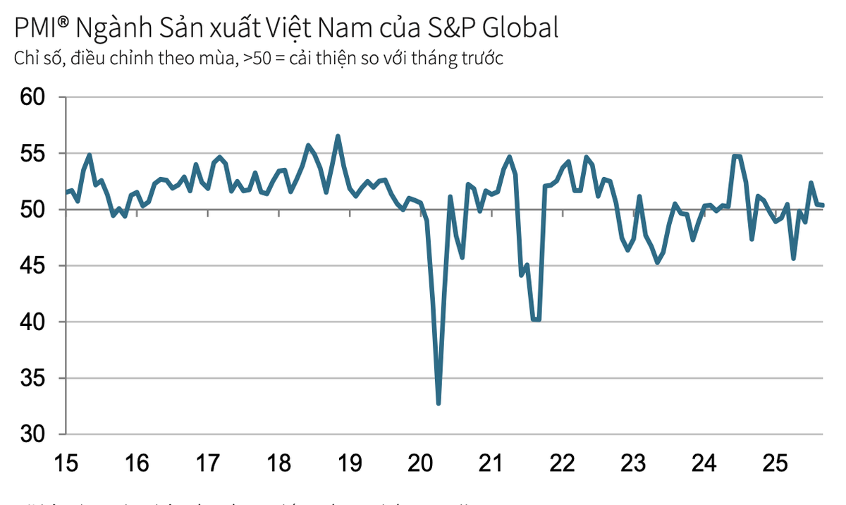 Chỉ số Nhà quản trị mua hàng - Purchasing Managers' IndexTM (PMI®) ngành sản xuất Việt Nam do S&P Global công bố giữ nguyên ở mức 50,4 điểm trong tháng 9, phản ánh sức khỏe ngành sản xuất tiếp tục cải thiện nhẹ. Đây là tháng thứ ba liên tiếp các điều kiện hoạt động được cải thiện.