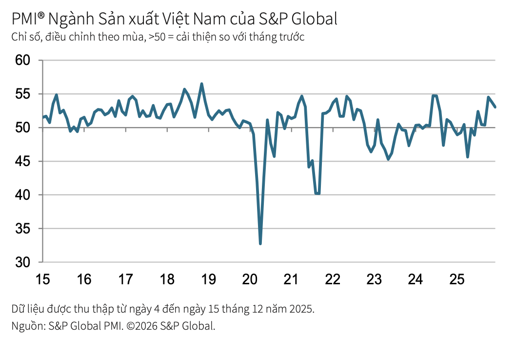 Theo S&P Global, Chỉ số Nhà Quản trị Mua hàng (PMI) ngành sản xuất Việt Nam trong tháng 12/2025 đạt 53,0 điểm, giảm nhẹ so với mức 53,8 điểm của tháng 11 nhưng vẫn duy trì trên ngưỡng 50 điểm. Kết quả này cho thấy các điều kiện kinh doanh tiếp tục được cải thiện, đồng thời đánh dấu tháng thứ sáu liên tiếp sức khỏe của ngành sản xuất đi lên.