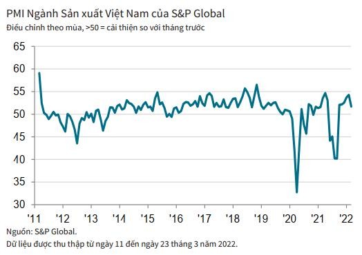 Andrew Harker, Giám đốc Kinh tế tại S&P Global, nói: “Sự bùng phát số lượng ca nhiễm COVID-19 ở Việt Nam trong tháng 3 đã ảnh hưởng nghiêm trọng tới lĩnh vực sản xuất, từ đó đẩy sản lượng lùi trở lại vùng suy giảm. Điều này chủ yếu là do tình trạng thiếu hụt lao động, khi có nhiều công nhân nghỉ làm vì nhiễm bệnh khiến các nhà máy không thể duy trì khối lượng sản xuất. Trong khi các công ty hy vọng mức độ nhiễm bệnh sớm giảm bớt, và ảnh hưởng của nó cũng nhẹ đi, xung đột Nga - Ukraine lại tiếp tục gây cản trở. Ảnh hưởng dễ nhận thấy nhất cho các công ty Việt Nam trong tháng 3 là về giá cả. Chi phí đầu vào đã tăng mạnh nhất trong gần 11 năm khi chi phí mua dầu và khí đốt tăng sau khi chiến tranh nổ ra. Điều này đã làm tiêu tan hy vọng rằng áp lực lạm phát có thể dịu đi trong những tháng tới”