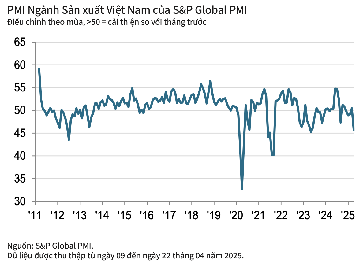 Ông Andrew Harker, Giám đốc Kinh tế tại S&P Global Market Intelligence đánh giá, việc áp thuế của Mỹ đã đẩy ngành sản xuất Việt Nam vào tình trạng suy giảm trong tháng 4, khi các công ty đang chứng kiến sự sụt giảm đáng kể của số lượng đơn đặt hàng mới, xuất khẩu và sản lượng. Hơn nữa, khả năng tiếp tục xảy ra gián đoạn cho ngành sản xuất do thuế quan bổ sung khiến niềm tin kinh doanh giảm và trở thành một trong những mức thấp nhất từng được ghi nhận.