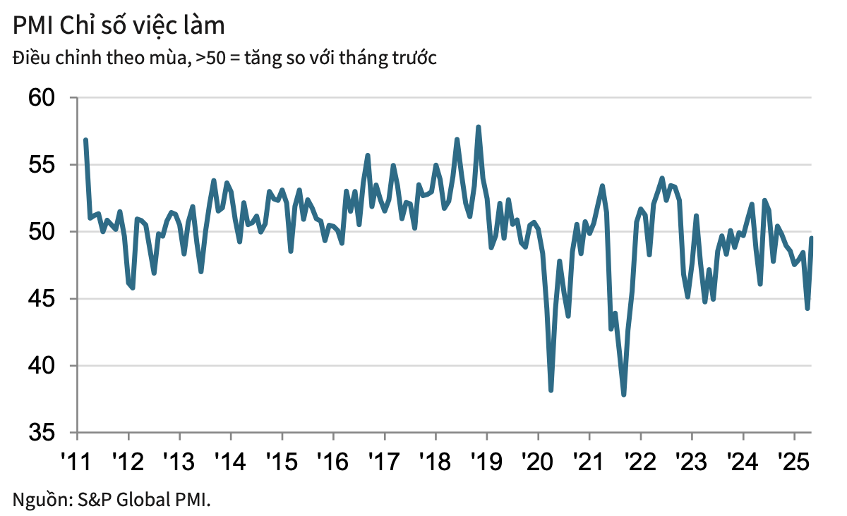 Cũng tương tự như xu hướng sản lượng, niềm tin kinh doanh đã cải thiện vào tháng 5 khi chính sách thuế ổn định hơn. Tuy nhiên, một số người trả lời khảo sát vẫn lo ngại về tác động tiềm tàng của thuế quan, từ đó tâm lý kinh doanh vẫn nằm hẳn dưới mức trung bình của lịch sử chỉ số.