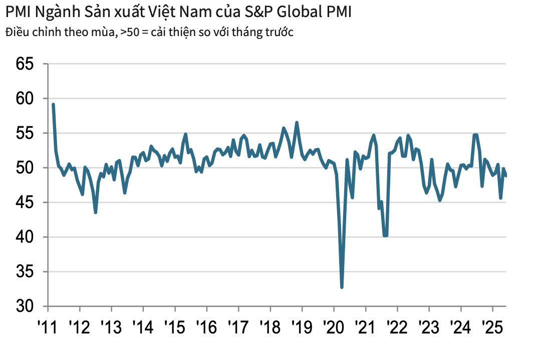 Chỉ số Nhà Quản trị Mua hàng (Purchasing Managers' Index™ – PMI) ngành sản xuất Việt Nam giảm xuống 48,9 điểm trong tháng 6, từ mức 49,8 điểm của tháng 5. Đây là tháng thứ ba liên tiếp chỉ số PMI nằm dưới ngưỡng 50 điểm, cho thấy các điều kiện kinh doanh tiếp tục suy giảm nhẹ khi nửa đầu năm sắp kết thúc.