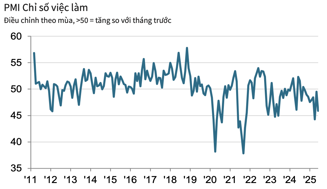 Cụ thể, số lượng nhân công giảm tháng thứ chín liên tiếp với tốc độ giảm nhanh hơn so với tháng 5. Thậm chí, các công ty vẫn có thể giảm lượng công việc tồn đọng với mức độ giảm mạnh.