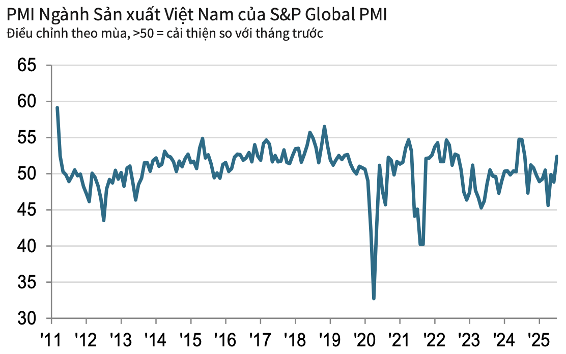 Chỉ số Nhà Quản trị Mua hàng - Manufacturing Purchasing Managers' IndexTM (PMI®) ngành sản xuất Việt Nam của S&P Global đạt kết quả 52,4 điểm trong tháng 7, tăng so với 48,9 điểm của tháng 6 và nằm trên ngưỡng 50 điểm lần đầu tiên trong 4 tháng qua. Kết quả này phản ánh sự cải thiện rõ nét trong sức khỏe tổng thể của ngành sản xuất, với điều kiện kinh doanh ghi nhận mức cải thiện mạnh nhất trong gần một năm qua.