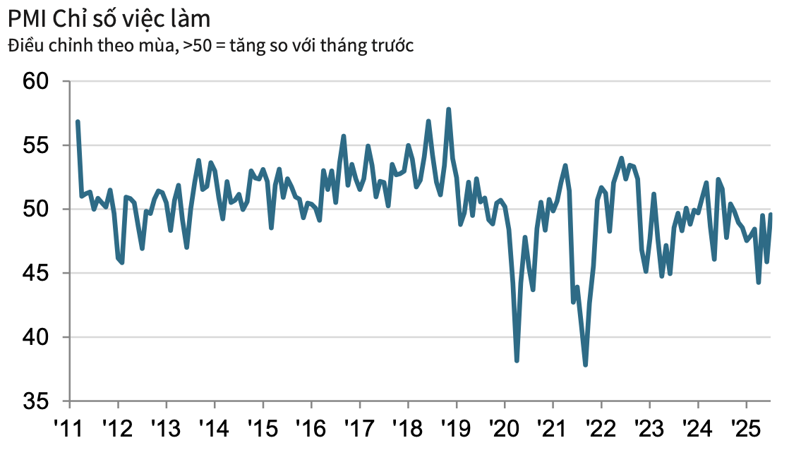 Trong khi đó, việc làm gần như ổn định, nhưng số lượng nhân sự vẫn tiếp tục giảm. Việc cắt giảm diễn ra trong bối cảnh các doanh nghiệp còn dư công suất sau giai đoạn đơn hàng sụt giảm trước đó. Tuy nhiên, nhờ nhu cầu sản xuất tăng trở lại, tốc độ giảm nhân sự trong tháng 7 đã chậm nhất trong 9 tháng qua.