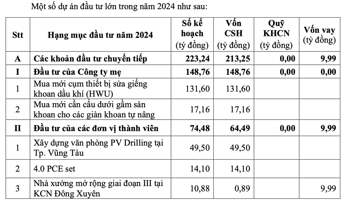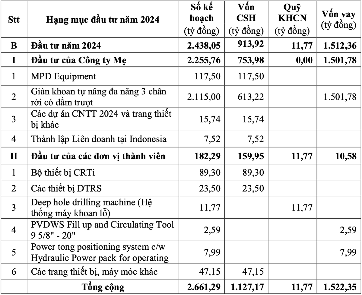 Vì vậy, PV Drilling có kế hoạch đầu tư trong năm 2024 khoảng 2.661 tỷ đồng (bao gồm 2.405 tỷ đồng tại Công ty Mẹ và 256 tỷ đồng tại các đơn vị thành viên), trong đó chủ yếu PV Drilling thực hiện các dự án chuyển tiếp từ năm 2023 như cụm thiết bị sửa giếng HWU, xây dựng nhà xưởng..., và đầu tư thêm giàn khoan tự nâng, thiết bị MPD, CRTi để đáp ứng nhu cầu thị trường.