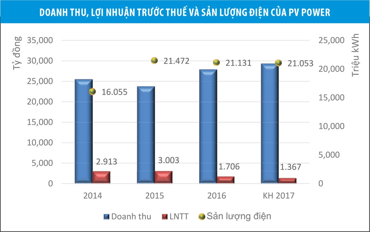 PV Power ước doanh thu cả năm 2016 đạt 27.890 tỷ đồng, lợi nhuận trước thuế 1.705,9 tỷ đồng. Theo đó, doanh thu tăng trưởng, nhưng lợi nhuận giảm đáng kể so với mức trên dưới 3.000 tỷ đồng giai đoạn 2014 - 2015.