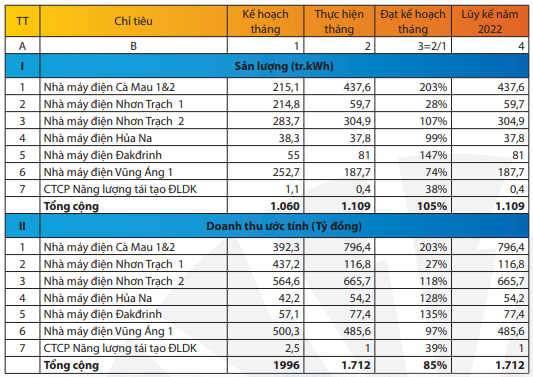 Trong đó, nhà máy điện Cà Mau 1&2 đạt sản lượng lớn nhất với 437,6 triệu kWh, đạt 203% kế hoạch. Tiếp theo là nhà máy điện Nhơn Trạch 2 và Vũng Áng 1 lần lượt đạt 304,9 triệu kWh và 187,7 triệu kWh, đạt 107% và 74% kế hoạch.