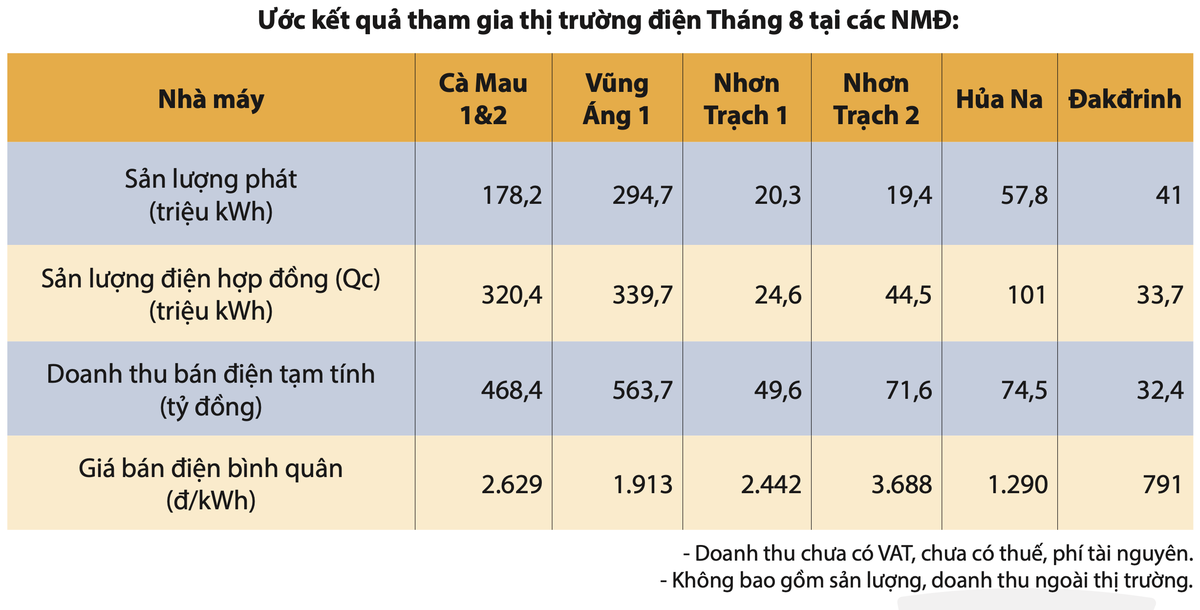 Theo đó, tổng sản lượng điện các nhà máy của POW ước đạt 612 triệu kWh, giảm 52% so với tháng 7 và đạt 58% kế hoạch tháng (1.054 triệu kWh). Doanh thu ước tính đạt 1.796 tỷ đồng, giảm 22% so với tháng 7 đạt 95% kế hoạch tháng (1.895 tỷ đồng).
