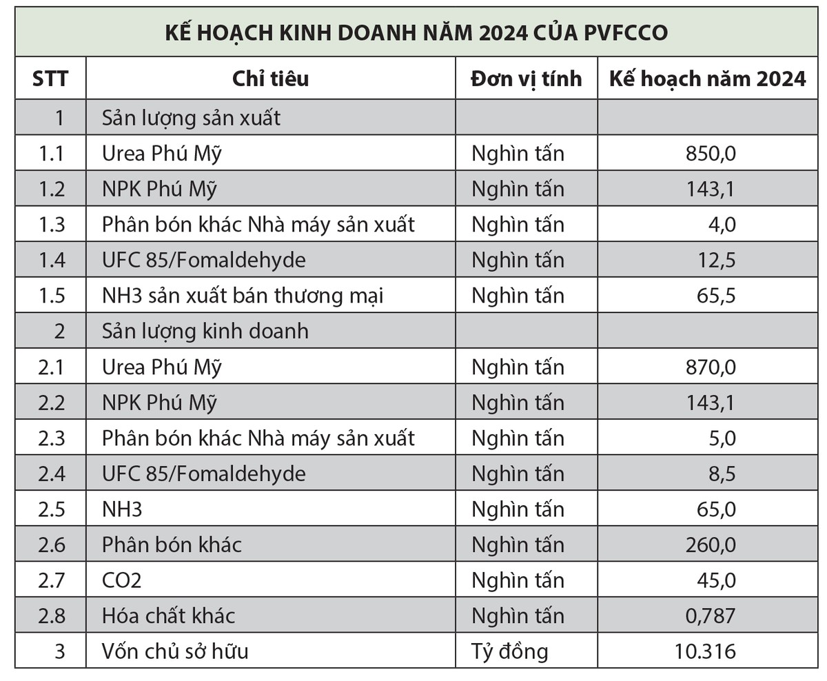 Năm 2024, PVFCCo đặt ra các nhiệm vụ và mục tiêu chính: vận hành các nhà máy sản xuất an toàn, ổn định và đảm bảo chất lượng sản phẩm; kinh doanh hiệu quả các sản phẩm phân bón, hóa chất với nỗ lực tăng cường quản lý chi phí, hạ giá thành sản phẩm; gia tăng thị phần và ứng dụng mạnh mẽ các giải pháp về công nghệ - chuyển số trong công tác bán hàng, tích cực triển khai nghiên cứu phát triển sản phẩm mới; tăng cường quản trị tài chính, quản trị rủi ro nhằm đảm bảo tình hình tài chính lành mạnh và nâng cao hiệu quả sử dụng tài sản hiện có, chuẩn bị các nguồn lực để triển khai các dự án đầu tư mới. Đây là các nhóm nhiệm vụ “xương sống” giúp Tổng công ty hình thành và hiện thực hóa các mục tiêu phát triển bền vững, tiếp tục cải thiện hiệu quả các chỉ tiêu phi tài chính, đem lại nhiều hơn nữa các lợi ích dài hạn cho cổ đông, đối tác và người lao động.