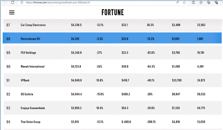 Vinh dự nằm trong Top 100 của Bảng xếp hạng, Petrovietnam Oil Corporation (Tổng công ty Dầu Việt Nam – PVOIL) xếp vị trí thứ 88 với doanh thu 4,3 tỷ USD.