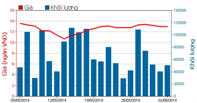 Biểu đồ giao dịch, khối lượng của cổ phiếu PVT 1 tháng gần đây. Nguồn: HOSE