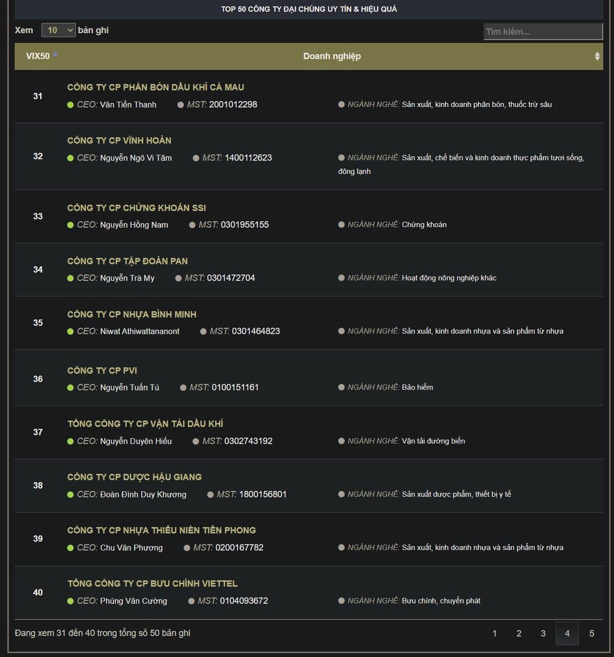 (ĐTCK) Công ty CP Báo cáo Đánh giá Việt Nam (Vietnam Report) vừa công bố Bảng xếp hạng VIX50 - Top 50 Công ty Đại chúng uy tín và hiệu quả năm 2025. Trong đó, Tập đoàn Công nghiệp Năng lượng Quốc gia Việt Nam (PVN) có 03 đơn vị thuộc khối Dầu Khí được vinh danh; Tổng công ty Cổ phần Vận tải Dầu khí (PVTrans, Mã chứng khoán: PVT) đứng vị trí 37.