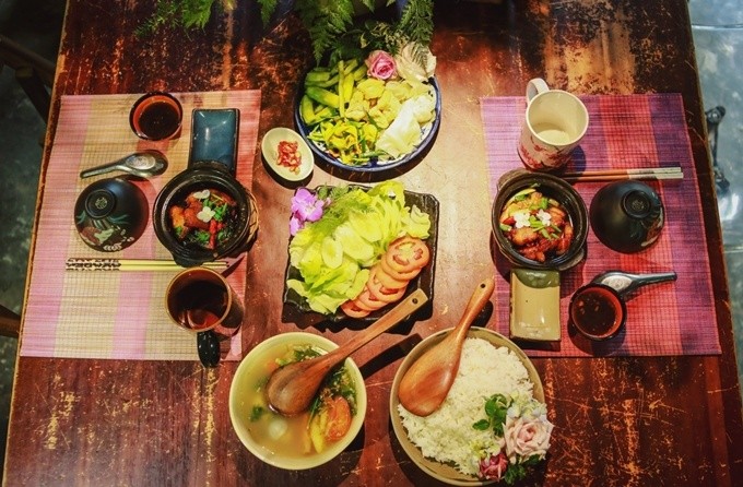 Nhiều du khách nước ngoài thích khám phá mâm cơm gia đình người Việt trong không gian nhiều hoa tươi.
