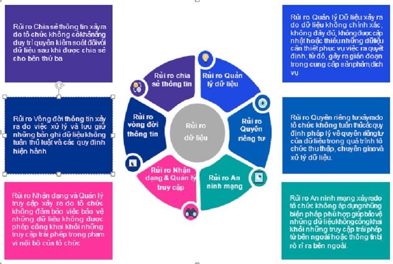 Rủi ro dữ liệu có thể được phân thành 06 nhóm bao gồm (i) Rủi ro Quản lý Dữ liệu, (ii) Rủi ro Quyền riêng tư, (iii) Rủi ro An ninh mạng, (iv) Rủi ro Nhận dạng và Quản lý truy cập, (v) Rủi ro Vòng đời thông tin, (vi) Rủi ro Chia sẻ thông tin.