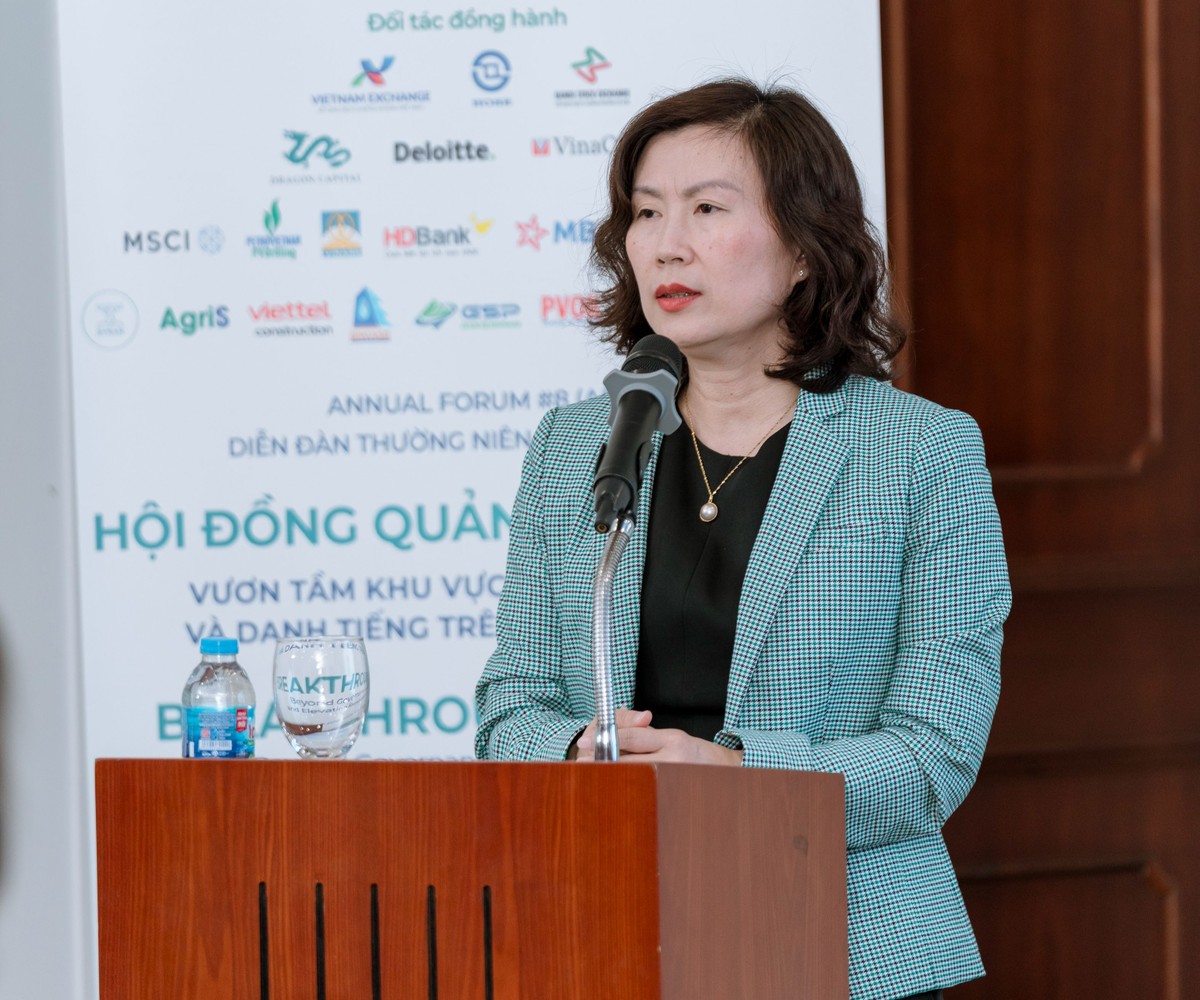 Về Hội đồng quản trị, bà Thanh cho biết, HĐQT dẫn dắt chiến lược phát triển (phải có ESG và chương trình quản trị công ty) và câu chuyện giá trị của công ty theo các phương pháp truyền thống dựa trên các chỉ số tài chính. Các thông tin phi tài chính sẽ tác động đến giá trị của doanh nghiệp là niềm tin và danh tiếng. Khi nói đến câu chuyện niềm tin và danh tiếng chính là năng lực cạnh tranh của doanh nghiệp. Năng lực cạnh tranh của doanh nghiệp đến từ 3 phần gồm định vị doanh nghiệp trên thị trường, khả năng cạnh tranh, và nguồn lực tài chính (là sức mạnh hay năng lực cứng năng lực lõi của doanh nghiệp.